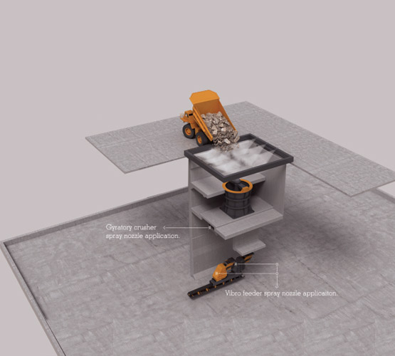 The majority of dust in a typical quarry is created during the extraction and crushing process. Dependent on the nature of the mineral, moisture content and particle sizes - the dust is released in to the environment during subsequent conveying, screening, stacking and loading operations. In order to prevent dust particles from getting airborne, foam is introduced in controlled measures at transfer points, immediately prior to the crushers or directly in to the crushers.This ensures that all the material is fully coated in Foam.